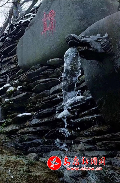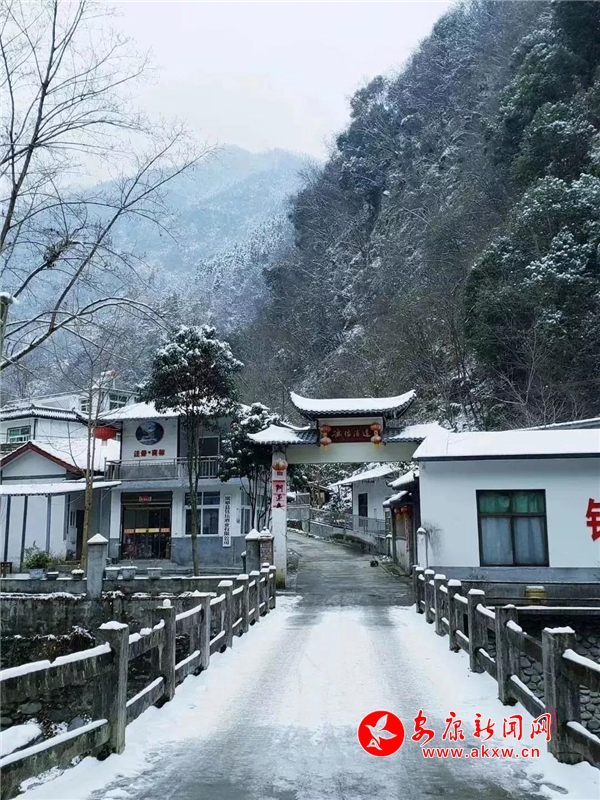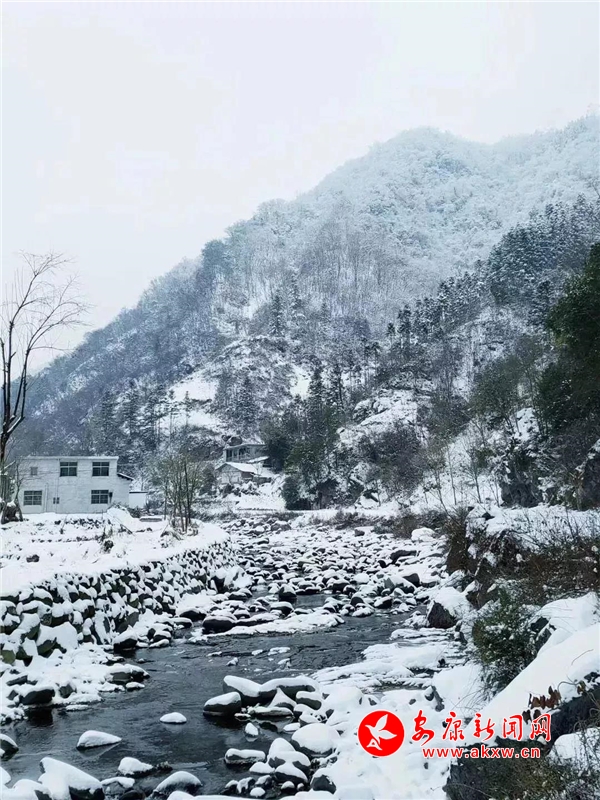 愈往深山走去,愈是銀裝素裹。發(fā)如雪,天作襯。色彩在這里失去了顏色,整個(gè)世界只剩下黑與白的構(gòu)圖。山澗中露出的黑巖,連綿著,將青絲的線條起伏蜿蜒地勾勒而出。山腳下一排排整齊的村民安置房,已顯出冬眠酣睡的樣子。樹林里帶著一層朦朧,在群山連綿中起伏著,為這雪天獻(xiàn)上了一幅絕美的水墨畫卷,也更增加了幾分神秘。