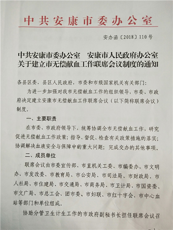 2、安康市率先在全省建立首個(gè)無(wú)償獻(xiàn)血聯(lián)系會(huì)議制度 安康無(wú)償獻(xiàn)血聯(lián)席會(huì)議制度是在安康市委、市政府領(lǐng)導(dǎo)下,由市委宣傳部等21個(gè)市級(jí)部門和單位組成,協(xié)助分管衛(wèi)生計(jì)生工作的市政府副秘書長(zhǎng)擔(dān)任聯(lián)席會(huì)議召集人。聯(lián)席會(huì)議每年召開(kāi)一次全體會(huì)議,主要職責(zé)為統(tǒng)籌協(xié)調(diào)全市無(wú)償獻(xiàn)血工作,研究促進(jìn)無(wú)償獻(xiàn)血工作相關(guān)政策,指導(dǎo)、督促、檢查有關(guān)政策措施的執(zhí)行落實(shí),協(xié)調(diào)解決血液安全與保障中的重大問(wèn)題。聯(lián)系會(huì)議制度的建立,標(biāo)志著我市無(wú)償獻(xiàn)血宣傳招募模式“政府主導(dǎo)、部門協(xié)作、社會(huì)參與、城鄉(xiāng)聯(lián)動(dòng)”的發(fā)展格局和長(zhǎng)效機(jī)制得到進(jìn)一步鞏固和提升。
