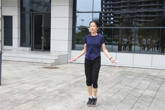 雙人項(xiàng)目考驗(yàn)的是默契度和耐力,不少組合也亮點(diǎn)紛呈,有面對面跳的,有側(cè)身對面跳的,還有背對著跳的,不管姿勢如何,共同的節(jié)奏是保持勝利的關(guān)鍵,當(dāng)然雙人跳到最后還得拼體力,不少選手氣息節(jié)奏被打亂,但大家都咬牙堅持,沒人選擇放棄,哪怕絆亂了繩子一次次重來也要堅持到最后一秒,周圍同事也不斷為場上選手加油鼓勁,氣氛相當(dāng)熱烈。