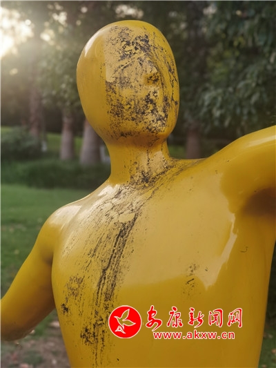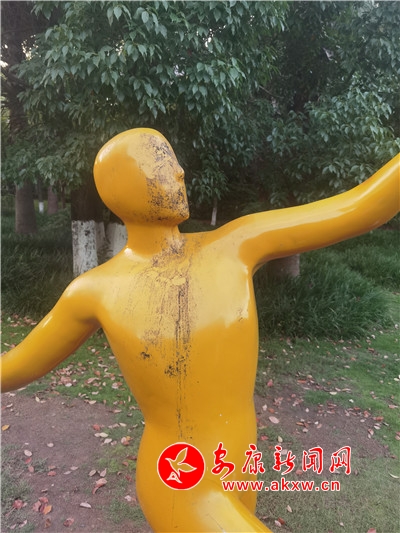五一期間,安康高新區(qū)運(yùn)動(dòng)公園內(nèi),一處運(yùn)動(dòng)塑像遭人“抹黑”,污跡斑斑,有礙觀瞻。(記者 許安)?