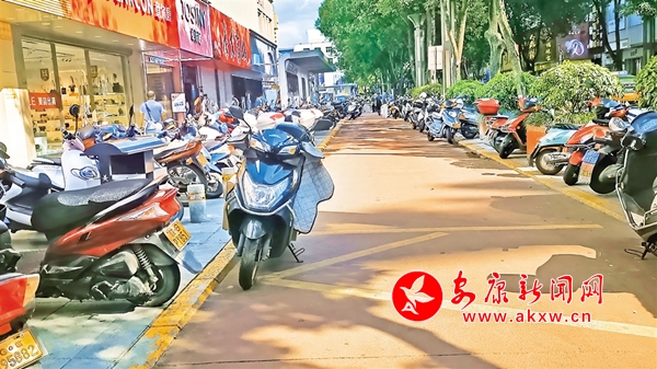 6月23日,金州南路東側(cè),摩托車(chē)、電動(dòng)車(chē)停放在公交港灣,存在安全隱患。(記者 吳單 攝)