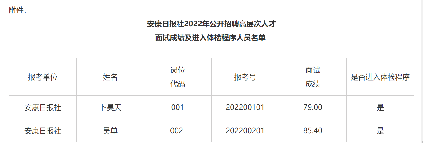 根據(jù)《安康日?qǐng)?bào)社2022年公開(kāi)招聘高層次人才公告》規(guī)定,現(xiàn)將安康日?qǐng)?bào)社2022年公開(kāi)招聘高層次人才面試成績(jī)及進(jìn)入體檢程序人員名單(見(jiàn)附件)、體檢有關(guān)事項(xiàng),公告如下: