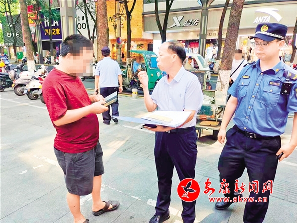 7月18日上午,漢濱城管執(zhí)法分局“‘痰’吐文雅,舉‘紙’得體”糾治組在金州路、白天鵝廣場以及公交車站附近巡查值守,對取證發(fā)現(xiàn)的隨地吐痰不文明行為進行法規(guī)宣傳教育,并采取罰款、微信朋友圈發(fā)公益廣告集贊等形式給予糾治。李東 攝