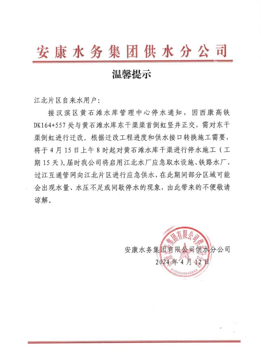本網(wǎng)訊 4月12日,安康水務集團有限公司供水分公司發(fā)布停水通知:因西康高鐵DK164+557處與黃石灘水庫東干渠渠首倒虹豎井正交,需對東干渠倒虹進行遷改。根據(jù)遷改工程進度和供水接口轉(zhuǎn)換施工需要,將于4月15日上午8時起對黃石灘水庫干渠進行停水施工(工期15天)。