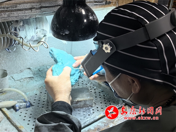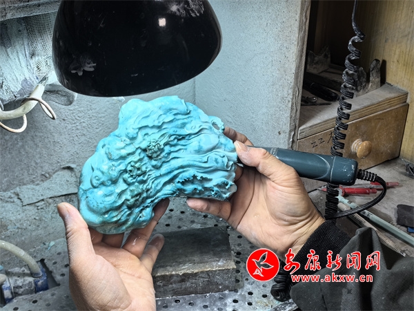 中國寶石琢玉藝術(shù)家徐安對白河綠松石進(jìn)行雕刻