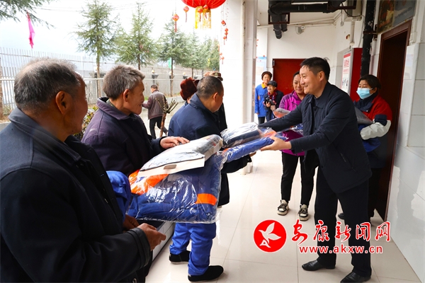 縣民政局局長(zhǎng)柯玉俠向老人發(fā)放換季衣物。