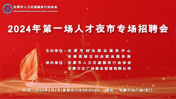 為有效保障企業(yè)用工需求,促進(jìn)未就業(yè)高校畢業(yè)生、退役軍人、城鎮(zhèn)失業(yè)人員、返鄉(xiāng)農(nóng)民工等各類(lèi)人員就業(yè),安康市創(chuàng)業(yè)就業(yè)服務(wù)中心、安康高新區(qū)創(chuàng)業(yè)就業(yè)服務(wù)局定于2024年8月2日(星期五)在安康高新區(qū)萬(wàn)達(dá)廣場(chǎng)1號(hào)門(mén)舉辦2024年第一場(chǎng)人才夜市專(zhuān)場(chǎng)招聘會(huì),現(xiàn)將活動(dòng)事項(xiàng)公告如下: