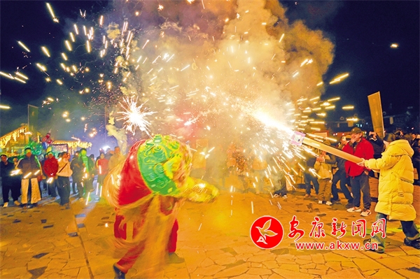 夜幕降臨,在中壩作坊小鎮(zhèn)廣場上,音樂響起,熊熊篝火燃燒,伴隨著動(dòng)感的音樂,游客與居民們手牽手,肩并肩,圍著篝火載歌載舞。而最吸引人的還是舞火龍、火獅子表演,在璀璨煙火中,火龍飛舞盤旋,火獅子搖頭晃腦,騰挪跳躍,威風(fēng)八面,現(xiàn)場不少游客噴起煙花,花燒得越旺、鑼鼓聲越急,獅子舞得也越歡快,大家共同享受著這場精彩紛呈的非遺文化盛宴。