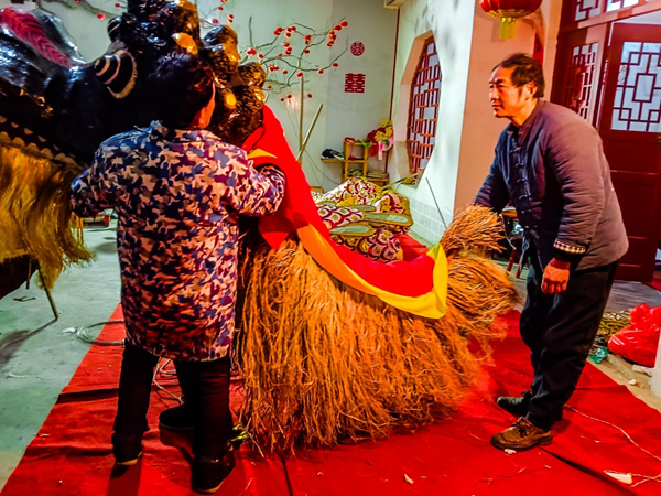 2月1日,大年初四,大家還沉浸在新年快樂(lè)中。喧天彩排鑼鼓一敲,嘹亮嗩吶一響,在雙河鎮(zhèn)政府的號(hào)召下,李忠寶帶著一群表演經(jīng)驗(yàn)豐富的文藝骨干、朝氣蓬勃的青年學(xué)生,換上演出行頭,帶著自制的花燈道具,開始李氏花燈游演排練。在現(xiàn)場(chǎng),彩色中國(guó)龍游動(dòng)、翻滾、盤踞,不停地變換著花樣;獅子騰躍、回旋、直立,時(shí)而威風(fēng)凜凜、時(shí)而憨態(tài)可掬……