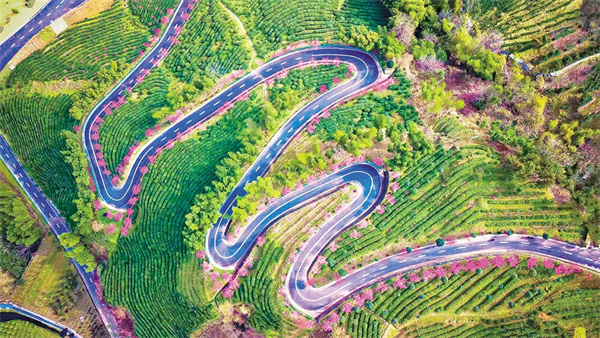 沿著茶山步道拾級(jí)而上,茶農(nóng)采青的竹簍與游人拍照的紗巾在梯田間次第閃現(xiàn)。粉白相間的梅花如云絮般綴滿枝頭,風(fēng)過(guò)處,花瓣簌簌落入茶叢,為嫩綠的新芽染上淡淡馨香。遠(yuǎn)處黛瓦白墻的徽派民居與近處起伏的茶壟構(gòu)成天然畫(huà)框,無(wú)人機(jī)視角下,蜿蜒的茶道如同玉帶纏繞山腰,將紅楓、櫻花、梅林串成斑斕的珠鏈。