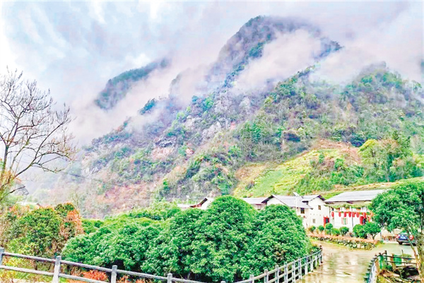 推開房門,晨霧尚未散盡,細(xì)雨斜斜地織著。老人們常說“有雨山戴帽,無雨半山腰”,這話在此時格外應(yīng)景——裊裊云霧沉甸甸地壓住遠處的峰頂,像給每座山頭都戴了一頂灰絨帽子,讓群山失去了往日的險峻,只留下青灰色的輪廓,恍若一幅優(yōu)美的寫意水墨畫。等到午后雨勢稍小,云霧退到半山腰,卻始終戀著大山不肯消散。隨著一陣陣微風(fēng)拂起,那些云霧像被吹落的玉帶,在墨綠的樹林間織出半透明的簾幕。