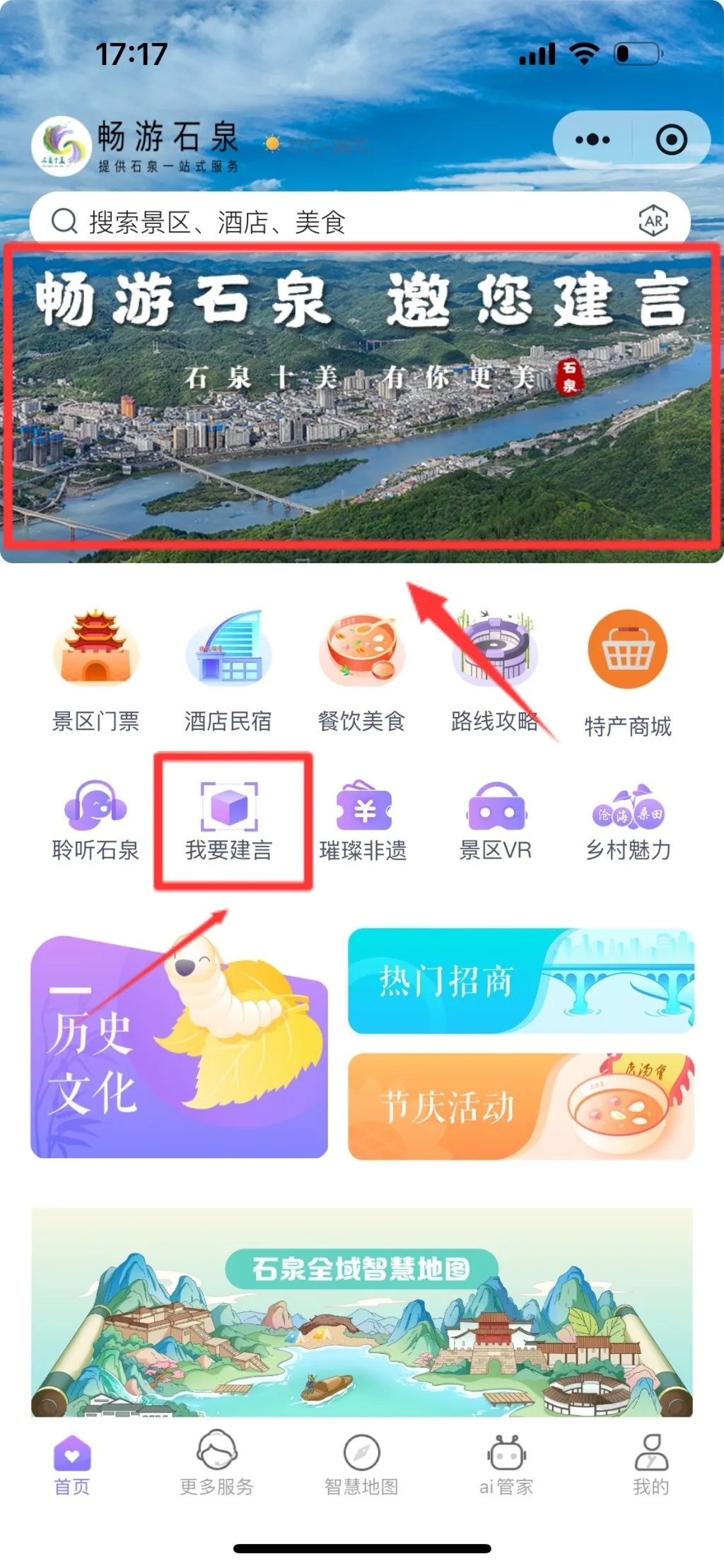 1.官方賬號:打開“暢游石泉”小程序,點擊“暢游石泉 邀您建言”意見建議征集頁面,提交建議。