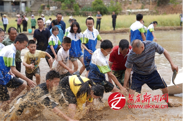 插秧比賽后緊接著開展了拔河比賽,參賽者們光著腳在泥濘的田里奮力拉扯,你來我往,互不相讓,田邊的觀眾則奮力地為自己支持的隊(duì)伍加油鼓勁。稻田抓鴨捕魚活動(dòng)讓現(xiàn)場氣氛更加熱烈,觀眾紛紛脫下鞋襪,卷起褲腿,在稻田中追逐游魚和鴨子,歡快的笑聲此起彼伏。?
