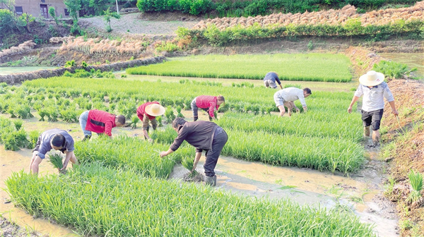 只見水田中村民們排成整齊的隊列,左手攥秧苗,右手飛快地從秧把中分出幾株,拇指與食指輕捻,穩(wěn)穩(wěn)插入泥中。彎腰、分苗、插秧,整套動作一氣呵成,不過兩三秒。濕潤的泥土裹挾著稻苗的清香,在插秧的節(jié)奏中升騰,勾勒出傳統(tǒng)農(nóng)耕的詩意與韻律。“別看這插秧動作簡單,講究可不少。秧苗入土深度要適中,太淺容易漂,太深影響生長?!蓖鯆鹬逼鹧亮税押?,褲腳沾滿泥漿卻笑得開懷,“這手藝都是祖輩傳下來的,我們種了一輩子地,只盼著秧苗茁壯成長?!?/p>