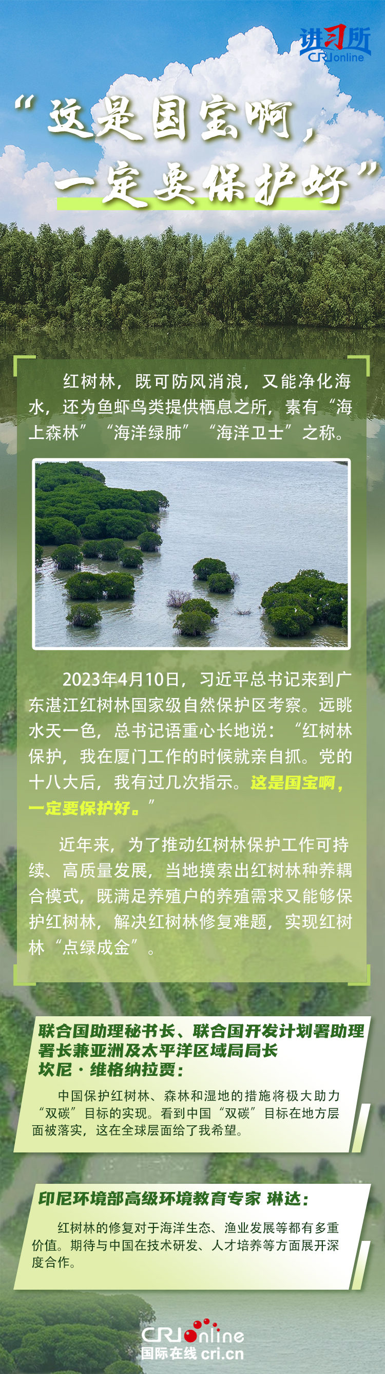 新時(shí)代以來,在習(xí)近平生態(tài)文明思想的科學(xué)指引下,“兩山”理念已深入人心,從“點(diǎn)綠成金”的紅樹林到一座座“花果山”,再到走向世界的長汀經(jīng)驗(yàn)……美麗中國建設(shè)邁出重大步伐,生態(tài)環(huán)境保護(hù)發(fā)生歷史性變化。國際社會認(rèn)為,中國取得廣泛的綠色發(fā)展成就,從根本上源于習(xí)近平生態(tài)文明思想,特別是“兩山”理念的指引。在通過綠色轉(zhuǎn)型推動經(jīng)濟(jì)可持續(xù)發(fā)展方面,中國正成為全球可持續(xù)發(fā)展的典范。