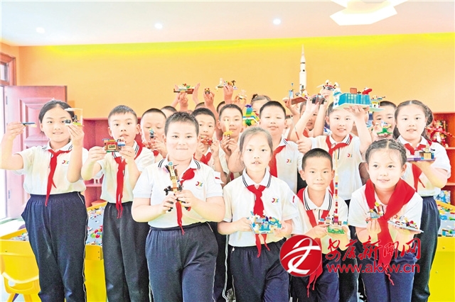 與古箏社團(tuán)室相鄰的“樂(lè)拼未來(lái)”樂(lè)高室里,學(xué)生們正分組搭建自己喜歡的模型。江蘇金壇捐贈(zèng)的樂(lè)高設(shè)備,為學(xué)校開(kāi)展科創(chuàng)教育提供了有力支撐。過(guò)去,學(xué)校課程以理論教學(xué)為主,現(xiàn)在孩子們可以通過(guò)動(dòng)手實(shí)踐,將創(chuàng)意轉(zhuǎn)化為現(xiàn)實(shí)。學(xué)校依托這些資源,成立了數(shù)學(xué)思維訓(xùn)練社團(tuán)。社團(tuán)以提升學(xué)生綜合素養(yǎng)為核心目標(biāo),著重培養(yǎng)學(xué)生專注力與沉穩(wěn)耐心的學(xué)習(xí)品質(zhì)。訓(xùn)練過(guò)程中,學(xué)生不僅需要通過(guò)動(dòng)手實(shí)踐與腦力思考開(kāi)展科學(xué)探究,還需在零件拼接的實(shí)踐活動(dòng)中,以細(xì)致嚴(yán)謹(jǐn)?shù)膽B(tài)度反復(fù)嘗試,逐步探索出正確的拼接方式,在實(shí)踐中深化對(duì)數(shù)學(xué)思維的理解與運(yùn)用。