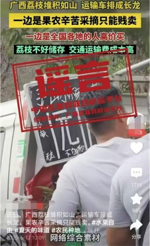 真相:6月12日,網(wǎng)傳“近日廣西荔枝堆積如山,運(yùn)輸車排成長(zhǎng)龍。果農(nóng)辛苦采摘只能賤賣”的視頻,畫面顯示荔枝堆積和“靈山荔枝1元”字樣。經(jīng)核查,視頻內(nèi)容并非發(fā)生在靈山縣。目前,靈山荔枝“妃子笑”等中熟品種逐漸批量上市,大規(guī)模上市時(shí)間為6月20日左右,當(dāng)前荔枝產(chǎn)銷有序開展,并未發(fā)現(xiàn)個(gè)別媒體報(bào)道的“荔枝滯銷賤賣”“采摘堆積成山”“運(yùn)輸車排成長(zhǎng)龍”的情況,也沒有發(fā)現(xiàn)價(jià)格低到1元的荔枝出售。(來(lái)源:“廣西互聯(lián)網(wǎng)違法和不良信息舉報(bào)”微信公眾號(hào))