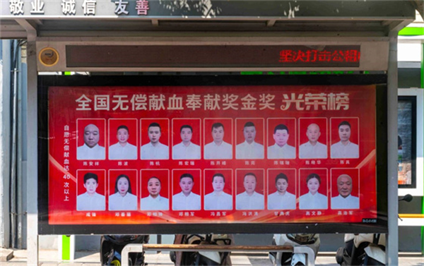 在第22個(gè)世界獻(xiàn)血者日到來之際,安康市中心血站精心策劃,自6月中旬起,在位于市政務(wù)大廳、市中心醫(yī)院、市中心醫(yī)院北院區(qū)門前的三處公交候車亭,以及中心城區(qū)兩處LED大屏上,全天循環(huán)展播著安康市榮獲“全國(guó)無償獻(xiàn)血奉獻(xiàn)獎(jiǎng)”終身榮譽(yù)獎(jiǎng)、金獎(jiǎng)、銀獎(jiǎng)、銅獎(jiǎng)的獲獎(jiǎng)?wù)叽盹L(fēng)采照片。