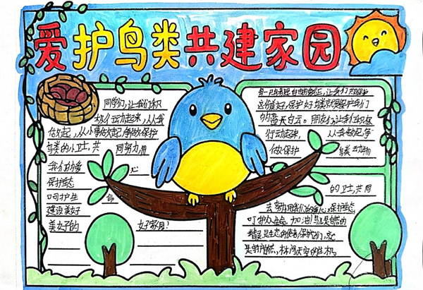 守護(hù)藍(lán)天精靈,共享美好家園!《安康高新區(qū)愛鳥護(hù)鳥倡議書》發(fā)布以來,全區(qū)的孩子們積極行動,他們用畫筆以純真之心勾勒出對鳥兒的關(guān)愛與守護(hù)。他們把對鳥兒的喜愛融進(jìn)顏料,將守護(hù)的心愿畫入畫紙。稚嫩的筆觸下,有給小鳥搭建的溫暖巢穴,有禁止捕鳥的醒目標(biāo)語,有鳥兒在藍(lán)天自由翱翔的愜意,有人類與鳥兒和諧共處的溫馨,有孩子們與鳥兒牽手同行的幻想…… (通訊員 劉松)