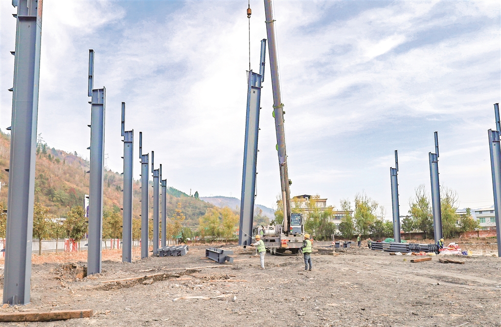 11月26日,紫陽高新區(qū)冷鏈倉儲物流園項(xiàng)目第一批鋼構(gòu)材料進(jìn)場,工人們正在開展吊裝作業(yè)。 肖昌尉 攝