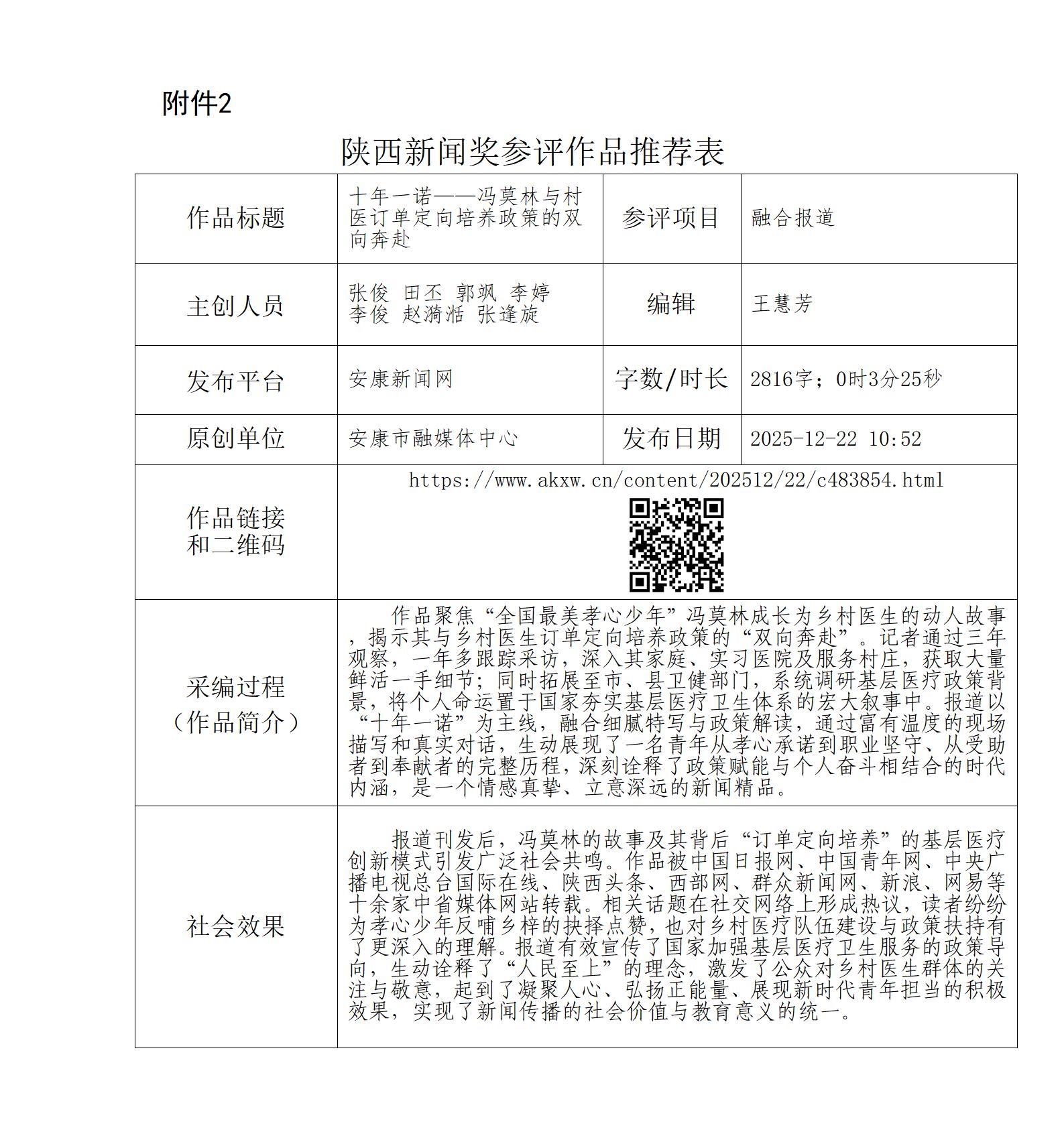 根據(jù)《陜西新聞獎(jiǎng)、陜西省優(yōu)秀新聞工作者評(píng)選辦法》和《關(guān)于開(kāi)展2025年度陜西新聞獎(jiǎng)融合報(bào)道、應(yīng)用創(chuàng)新和新媒體新聞專(zhuān)欄作品推優(yōu)工作的通知》要求,經(jīng)個(gè)人申報(bào)、部門(mén)推薦和中心編委會(huì)嚴(yán)格篩選,對(duì)以下3件2025年度陜西新聞獎(jiǎng)融合報(bào)道、應(yīng)用創(chuàng)新、新媒體新聞專(zhuān)欄參評(píng)作品進(jìn)行公示。(作品推薦表附后)