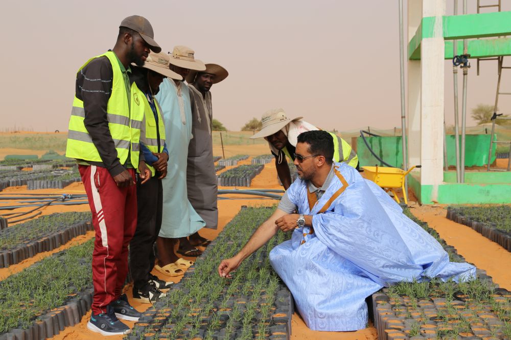 2025年5月22日,在毛里塔尼亞西部特拉扎區(qū)比爾·巴爾卡村,中非綠色技術(shù)公園毛里塔尼亞示范項(xiàng)目毛方協(xié)調(diào)員圖拉德·邁杜向工人傳授固沙植物種植技術(shù)。新華社記者 司源 攝