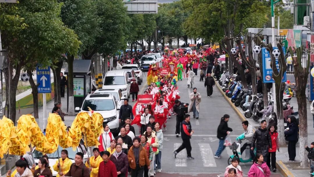 在主會(huì)場(chǎng)定點(diǎn)展演環(huán)節(jié),各支隊(duì)伍各顯神通。率先登場(chǎng)的威風(fēng)鑼鼓隊(duì)由老中青三代村民組成,整齊劃一的動(dòng)作、雄渾震撼的節(jié)奏,敲出了鄉(xiāng)村振興的精氣神。彩獅隊(duì)則展現(xiàn)了半個(gè)多世紀(jì)的傳承堅(jiān)守,這支成立于1972年的隊(duì)伍,隊(duì)員年齡跨度橫跨四代,紅綢舞動(dòng)間,雄獅騰躍翻滾,贏得陣陣叫好。