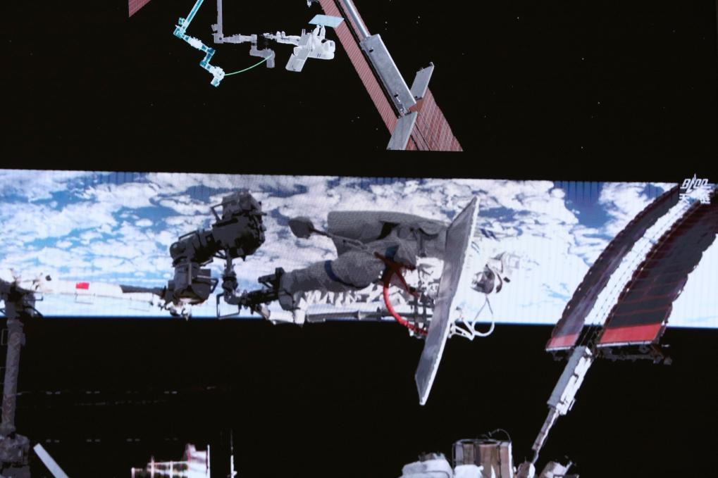 △這是2026年4月16日在北京航天飛行控制中心屏幕上拍攝的神舟二十一號(hào)乘組航天員武飛在艙外工作的畫面。