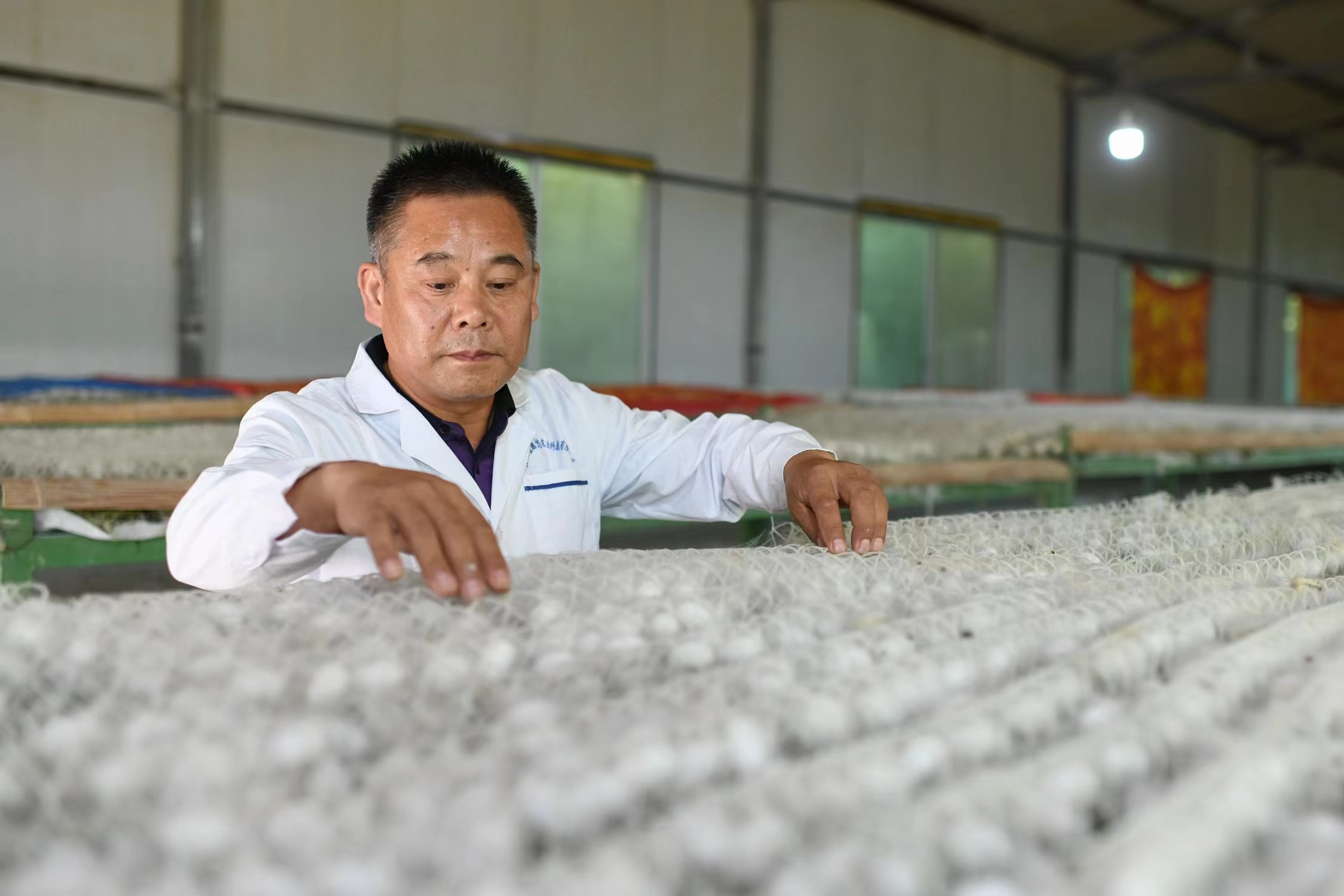 胡文迅查看春蠶上蔟情況 李宇翔 攝