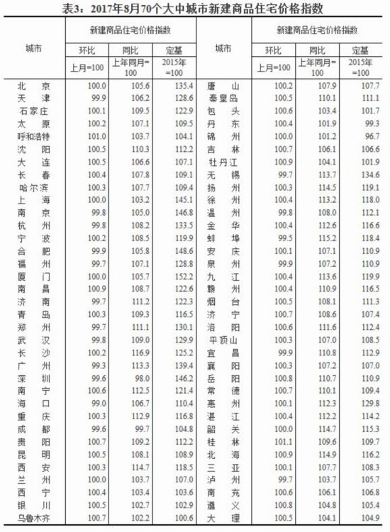 2017年8月70個大中城市新建商品住宅價格指數(shù)。來源:國家統(tǒng)計(jì)局