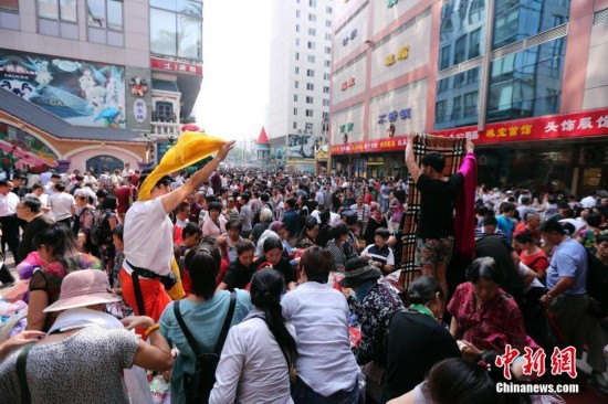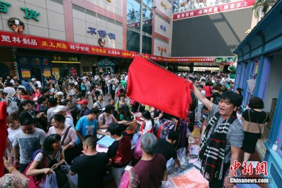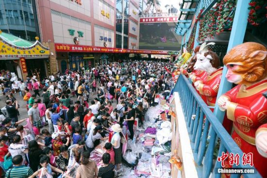 9月15日,商戶在北京天意商城甩賣商品,吸引大批顧客搶購。天意商城是北京規(guī)模最大的小商品批發(fā)兼零售市場(chǎng),為疏解北京非首都功能,天意商城將于9月16日關(guān)門停業(yè)。中新社記者 盛佳鵬 攝