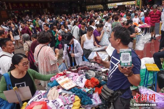 9月15日,天意商戶舉起二維碼方便顧客掃碼支付,以新式支付方式助力傳統(tǒng)零售。當(dāng)日,自1992年開業(yè)至今的北京天意市場(chǎng)迎來其在北京西城阜外大街營業(yè)的最后一日,商家趁機(jī)“瘋狂甩貨”,大批北京民眾也紛至沓來。這里曾是北京著名的小商品商城,聚集了數(shù)千家商戶。為疏解北京非首都功能,天意商城將于本月16日關(guān)門停業(yè)。中新社記者 崔楠 攝