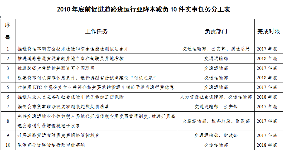 2018年底前,完成降本減負10件實事(見附件),推動政策落地并取得實質(zhì)性進展。制度性交易成本大幅降低,貨車司機生產(chǎn)生活條件顯著改善,貨運業(yè)戶的獲得感和貨車司機的歸屬感持續(xù)增強,行業(yè)平穩(wěn)發(fā)展的基礎(chǔ)更加牢固。