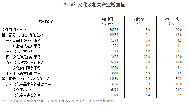 數(shù)據(jù)顯示,根據(jù)《文化及相關(guān)產(chǎn)業(yè)分類(2012)》和《文化及相關(guān)產(chǎn)業(yè)增加值核算方法》的規(guī)定和要求,經(jīng)核算,2016年全國文化及相關(guān)產(chǎn)業(yè)增加值為30785億元,比上年增長13.0%(未扣除價格因素,下同),比同期GDP名義增速高4.4個百分點;占GDP的比重為4.14%,比上年提高0.17個百分點。2016年文化及相關(guān)產(chǎn)業(yè)保持平穩(wěn)快速增長,比重穩(wěn)步上升,對促進經(jīng)濟轉(zhuǎn)型升級、平穩(wěn)健康可持續(xù)發(fā)展發(fā)揮了重要作用。