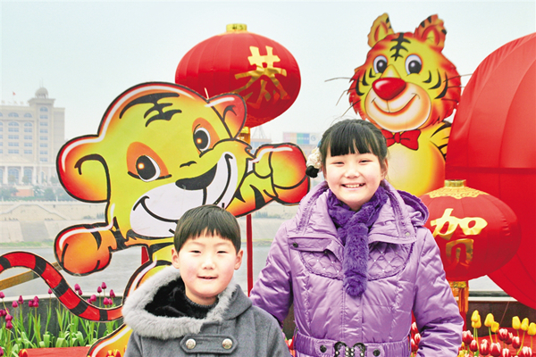 那些年每年春節(jié),相關(guān)單位都會在安康城區(qū)重要的游玩場所布置生肖的卡通畫像等花燈。這兩個小朋友也要站在生肖“虎寶寶”前拍照留念(圖五)。預(yù)祝著來年“虎虎生威,虎年大吉……”