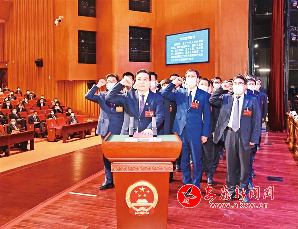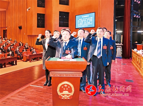 新當(dāng)選的市級(jí)國(guó)家機(jī)關(guān)工作人員向憲法宣誓,新當(dāng)選的市五屆人大常委會(huì)主任王彪、市人民政府市長(zhǎng)武文罡分別領(lǐng)誓。