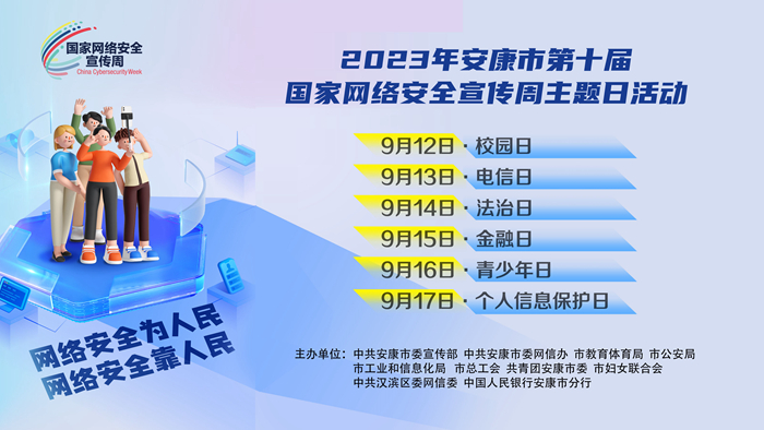 此次宣傳周由市委宣傳部、市委網(wǎng)信辦、市教體局、市公安局、市工信局、市總工會(huì)、共青團(tuán)安康市委、市婦女聯(lián)合會(huì)、漢濱區(qū)委網(wǎng)信委和中國(guó)人民銀行安康市分行十部門(mén)聯(lián)合舉辦,精彩紛呈,不容錯(cuò)過(guò)。