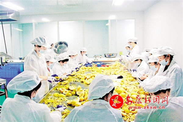 中廠鎮(zhèn)石梯社區(qū)木瓜產業(yè)園區(qū)里工人們?yōu)槟竟先テ。王?攝