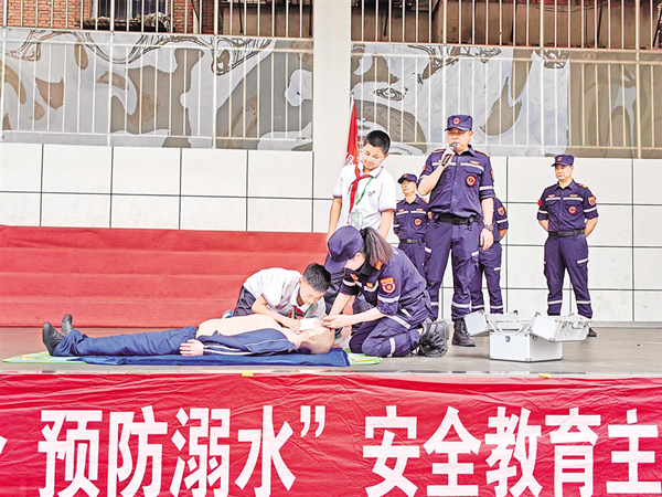 漢江志愿者救生隊(duì)進(jìn)學(xué)校開展防溺水知識演練。鄭時根 攝