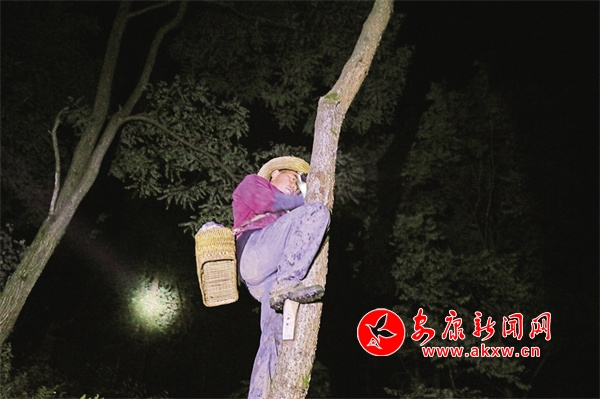 從19歲開始,羅宗兵就和這片漆林打交道,哪兒有幾棵樹,哪棵樹上有幾個(gè)口子,他都一清二楚。只見羅宗兵頭戴礦燈,熟練地爬到一棵漆樹上,用割漆刀在原來(lái)開過口的“牛鼻子”位置輕輕一割,乳白色的液體冒出,隨之緩緩流入到用稠樹葉制作的器皿中。因?yàn)樯嵊懈g性,所以割漆人盛漆選擇的都是楠樹葉或稠樹葉。上樹、下樹、轉(zhuǎn)彎、過河、爬坡……在伸手不見五指的漆林里,羅宗兵穿梭自如。