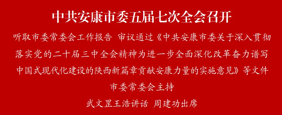 全會由市委常委會主持。市委書記武文罡講話并就《中共安康市委關(guān)于深入貫徹落實黨的二十屆三中全會精神為進(jìn)一步全面深化改革奮力譜寫中國式現(xiàn)代化建設(shè)的陜西新篇章貢獻(xiàn)安康力量的實施意見》作說明。市委副書記、市長王浩部署經(jīng)濟(jì)工作。市政協(xié)主席周建功出席會議。市委常委、統(tǒng)戰(zhàn)部部長、政法委書記寇全安就《中共安康市委關(guān)于在中國式現(xiàn)代化道路上建設(shè)平安祥和幸福安康的實施意見》作說明,市委常委、市紀(jì)委書記、市監(jiān)委主任羅曉君就《中共安康市委關(guān)于在中國式現(xiàn)代化道路上建設(shè)風(fēng)清氣正幸福安康的實施意見》作說明。