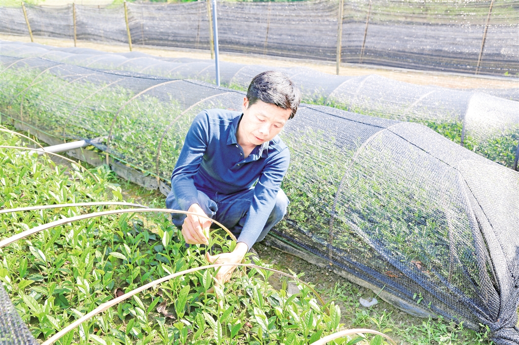 王衍成查看茶苗長(zhǎng)勢(shì)