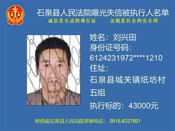 為了進(jìn)一步加大執(zhí)行力度,保障勝訴當(dāng)事人的合法權(quán)益,推進(jìn)社會誠信體系建設(shè),依照《中華人民共和國民事訴訟法》《最高人民法院關(guān)于公布失信被執(zhí)行人名單信息的若干規(guī)定》等法律、司法解釋的有關(guān)規(guī)定,現(xiàn)對一批已進(jìn)入執(zhí)行程序,且尚未全部履行義務(wù)的被執(zhí)行人進(jìn)行媒體曝光,歡迎廣大群眾支持石泉縣人民法院的工作,向我院提供被執(zhí)行人的財產(chǎn)線索,使生效法律文書能夠得到切實執(zhí)行,讓人民群眾切實感受到公平正義就在身邊。