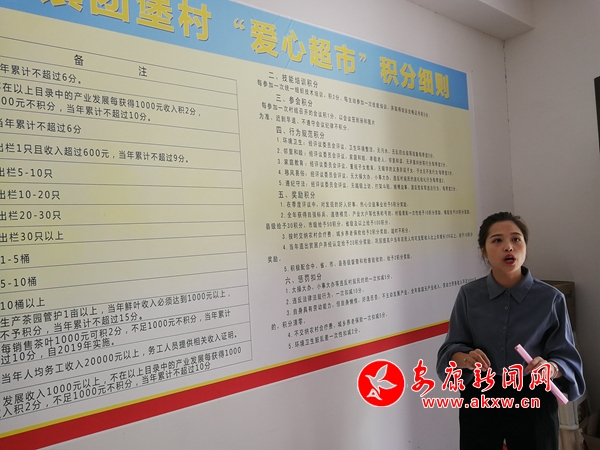 今年4月29日,61歲的田遠樹和丈夫一起來到愛心超市,兌換了大米和消毒液,她說:“我們表現(xiàn)好,就能兌換積分拿東西,政策好啊”。原來,他們一家種茶、養(yǎng)蜂、養(yǎng)豬、養(yǎng)雞,因為產(chǎn)業(yè)發(fā)展的好,積分就高,后來田遠樹被村里評為好媳婦,又有了加分項目。