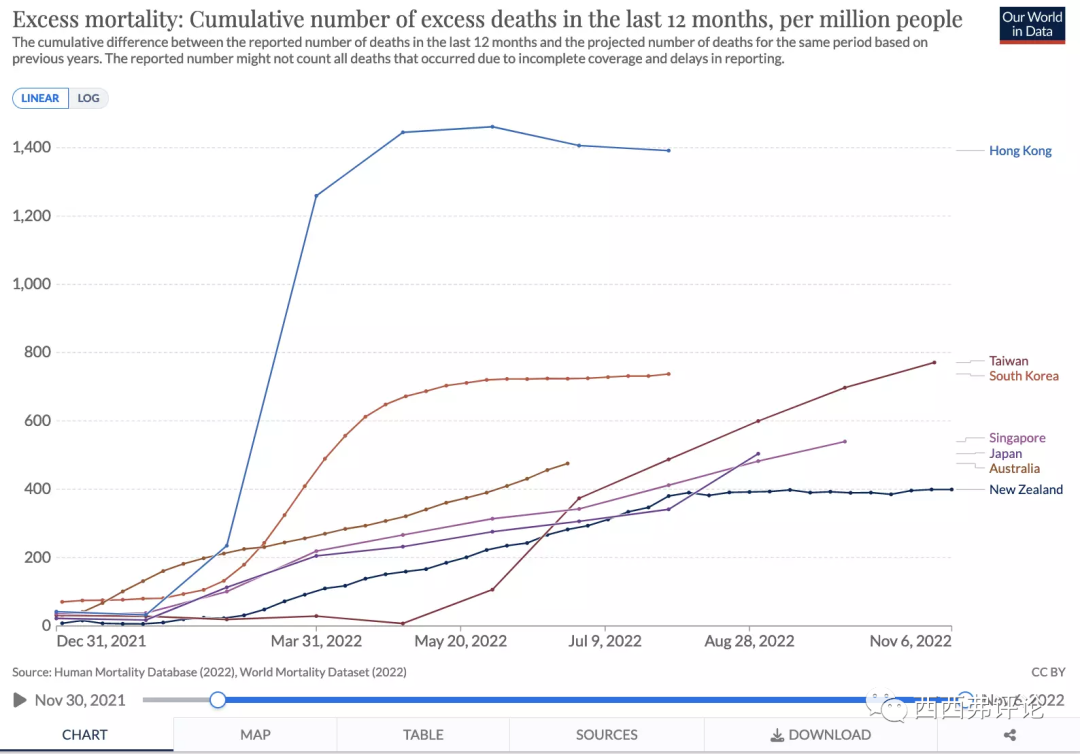 過去十二個(gè)月的累計(jì)超額死亡率,香港飆升到了萬分之十四,臺灣接近萬分之八,新加坡也超過了萬分之五。目前只有新西蘭,還在萬分之五以下。即使這樣,這幾個(gè)國家或地區(qū)在整個(gè)疫情期間的超額死亡率,仍然遠(yuǎn)遠(yuǎn)低于大部分歐美國家,他們?nèi)匀皇强挂叩膬?yōu)等生。