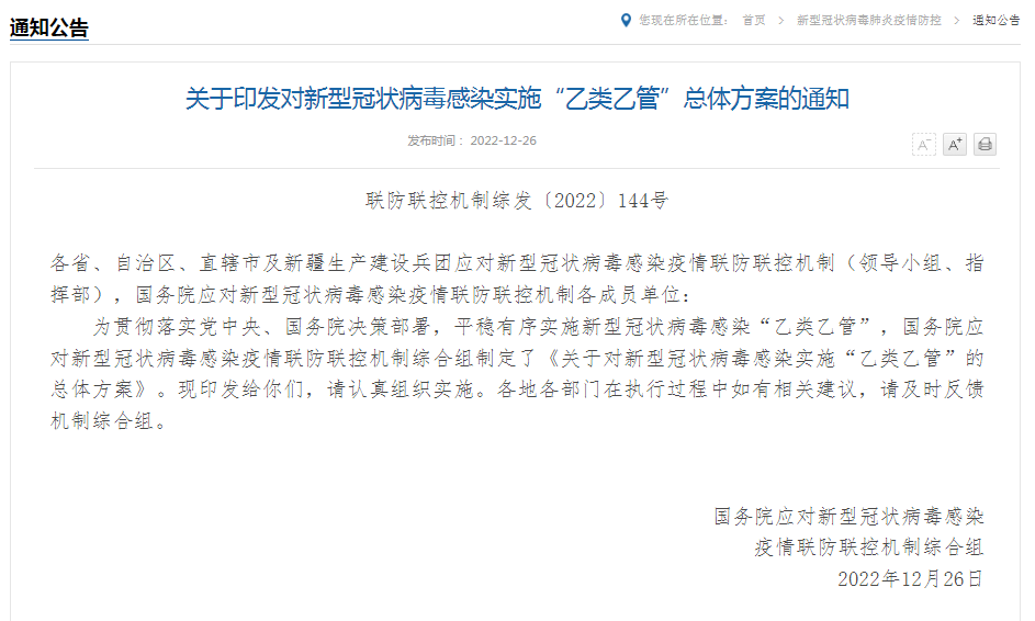 關(guān)于印發(fā)對(duì)新型冠狀病毒感染實(shí)施“乙類乙管”總體方案的通知