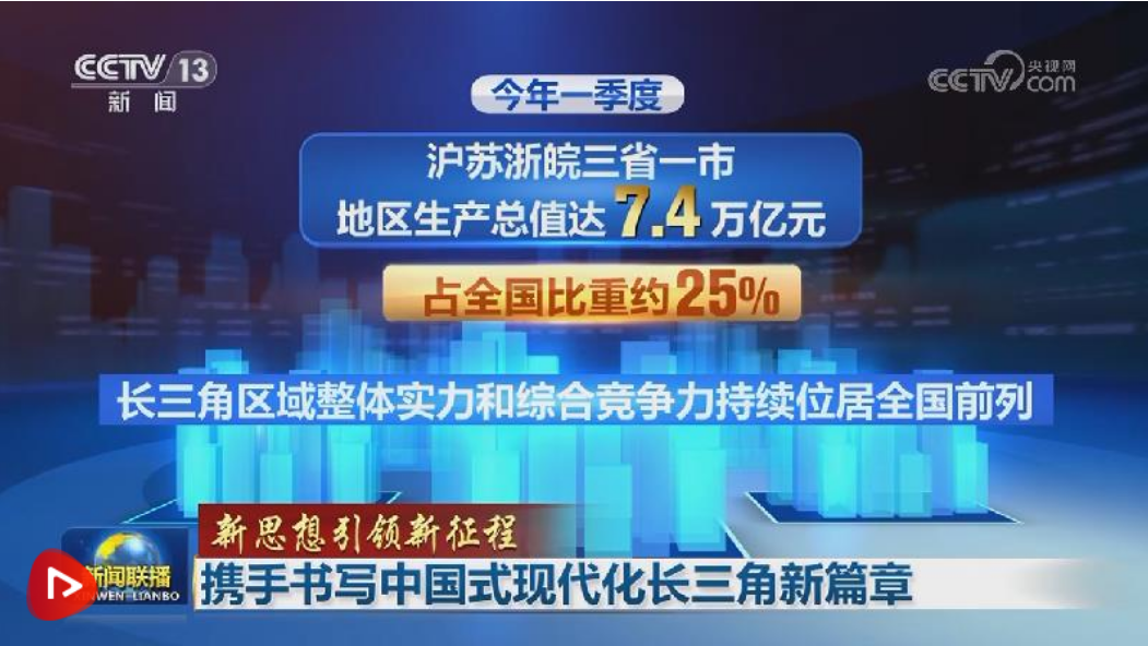 長三角地區(qū)以4%的國土面積,集聚了全國約17%的人口,創(chuàng)造了全國近1/4的經濟總量,是經濟最活躍、開放程度最高、創(chuàng)新能力最強的區(qū)域之一。今年一季度,滬蘇浙皖三省一市地區(qū)生產總值達7.4萬億元,占全國比重約25%,長三角區(qū)域整體實力和綜合競爭力持續(xù)位居全國前列。