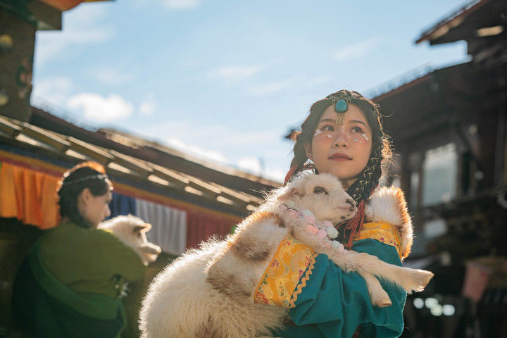 2023年3月8日,游客在迪慶州香格里拉市獨克宗古城拍照留念。