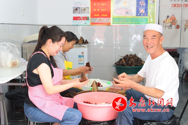 現(xiàn)下正是粽子產(chǎn)銷(xiāo)旺季,而彈牙清香的傳統(tǒng)手工粽最有兒時(shí)的端午味,更受消費(fèi)者追捧。在漢濱區(qū)五星街的“粽老頭”非遺工坊內(nèi),“粽老頭”粽子制作技藝非遺傳承人馬峰亮正和工人們一起,趕制粽子訂單。