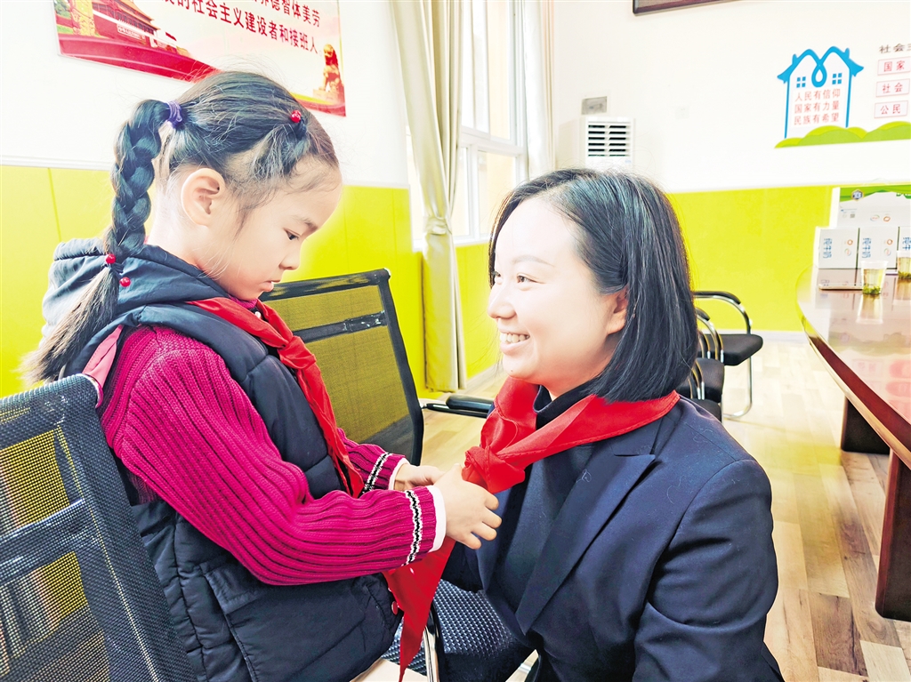 學(xué)生為愛心人士系上紅領(lǐng)巾。